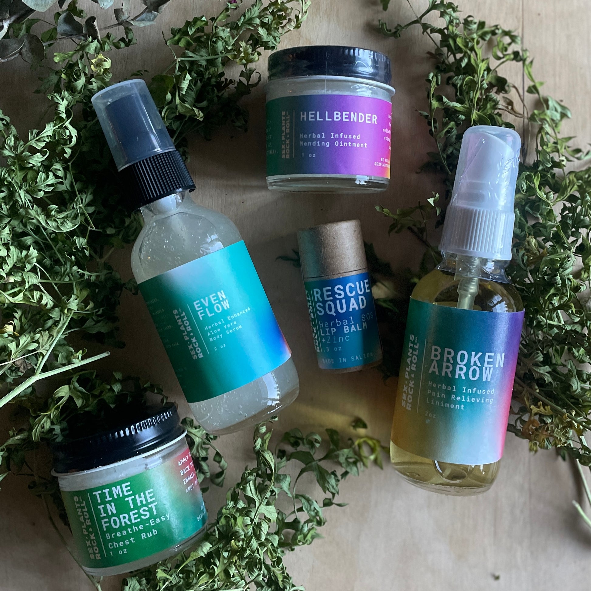 Hellbender - for cuts, bumps, bruises, burns, bites. All herbs are safe internally so can be used on open wounds. The blend is primarily sourced wild from the mountains where we play and unironically the source of most of our said cuts, bumps, bruises, burns and bites. It's a great hippie wound care.