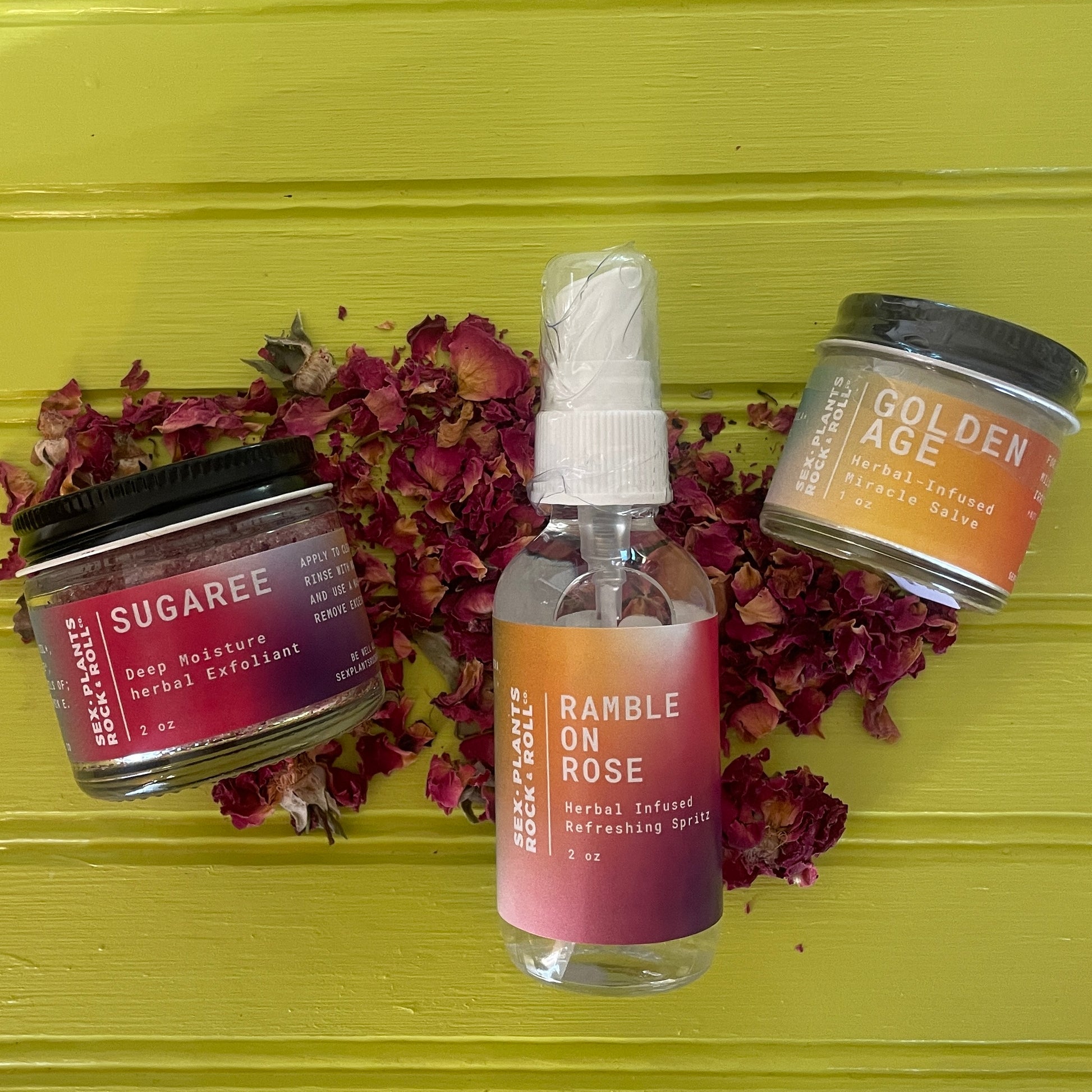 Ramble on Rose: aqua, organic rose, 2% organic witch hazel extract, aloe vera, aspen bark extract.