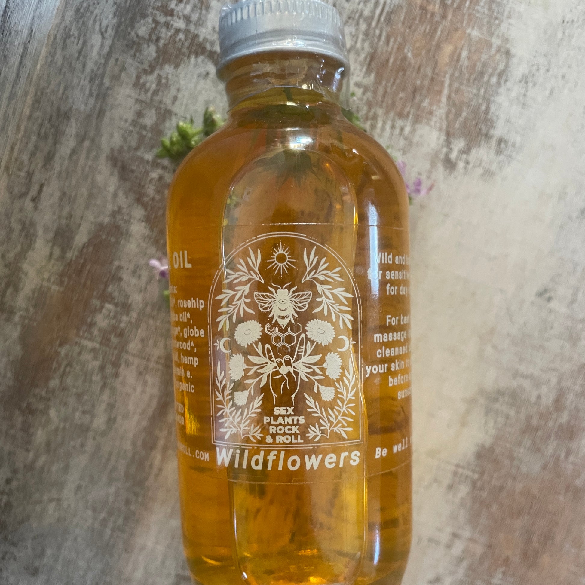 Ingredients: Organic apricot kernel oil, organic hemp oil, organic rosehip seed oil, broccoli seed oil, wildcrafted borage flowers, wildcrafted globe mallow flowers, organic calendula oil, wildcrafted cottonwood bud.